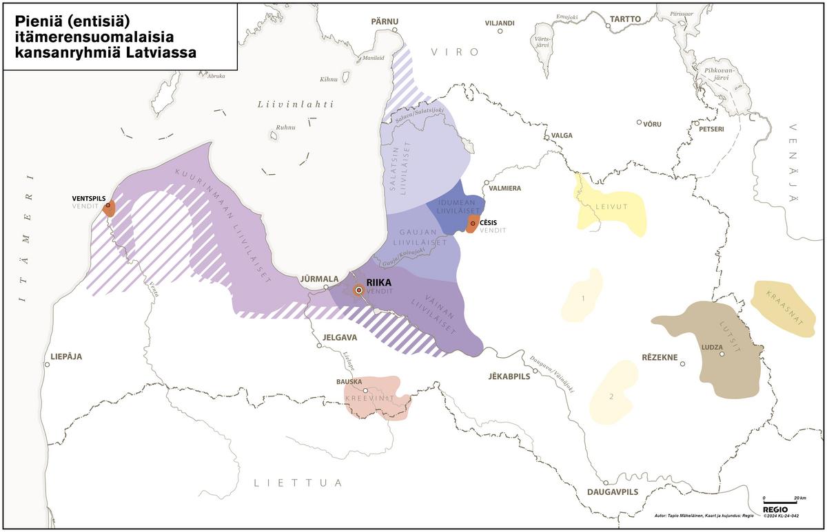 Liiviläiset kuvaa eri tutkijoiden (arkeologit, lingvistit sekä latvialaiset että virolaiset) tutkimuksista yhdistelemällä saatua arveltua mahdollista tilannetta noin 1100-luvun puolivälissä (lukuun ottamatta vendien asuinpaikkoja). Yhtenäisellä värillä on merkitty pääasuinalueet, poikkiviivoituksella alueet, joissa eri liiviläisten heimojen ohella on ilmeisesti asunut myös muita kansoja.